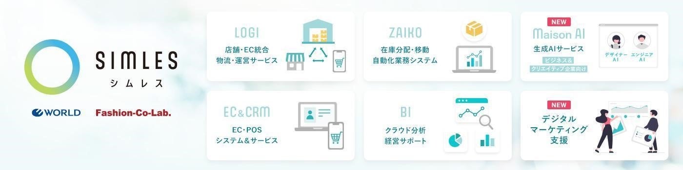 本展示会では店舗・EC・物流をシームレスに繋ぎ、粗利を最大化する販売と物流のOMOソリューション「SIMLES(シムレス)」、ビジネス×クリエイティブ企業向け生成AIサービス「Maison AI」、そしてワールドの事業経験に基づいた顧客データ分析、活用ノウハウなどアパレル業界に特化した「デジタルマーケティング支援」サービスを紹介します。