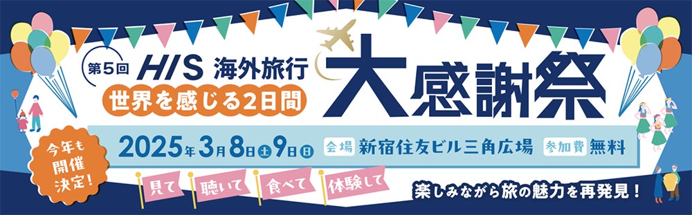 株式会社エイチ・アイ・エス(本社:東京都港区 以下、HIS)は、“見る・聴く・食べる・体験する“を通して、楽しみながら旅の魅力を再発見していただくことを目的とし、第5回「HIS海外旅行大感謝祭」を2025年3月8日(土)・9日(日)の2日間、新宿住友ビル三角広場にて開催します。
