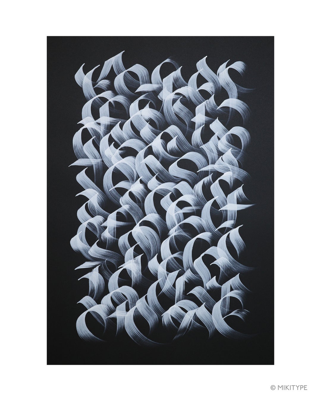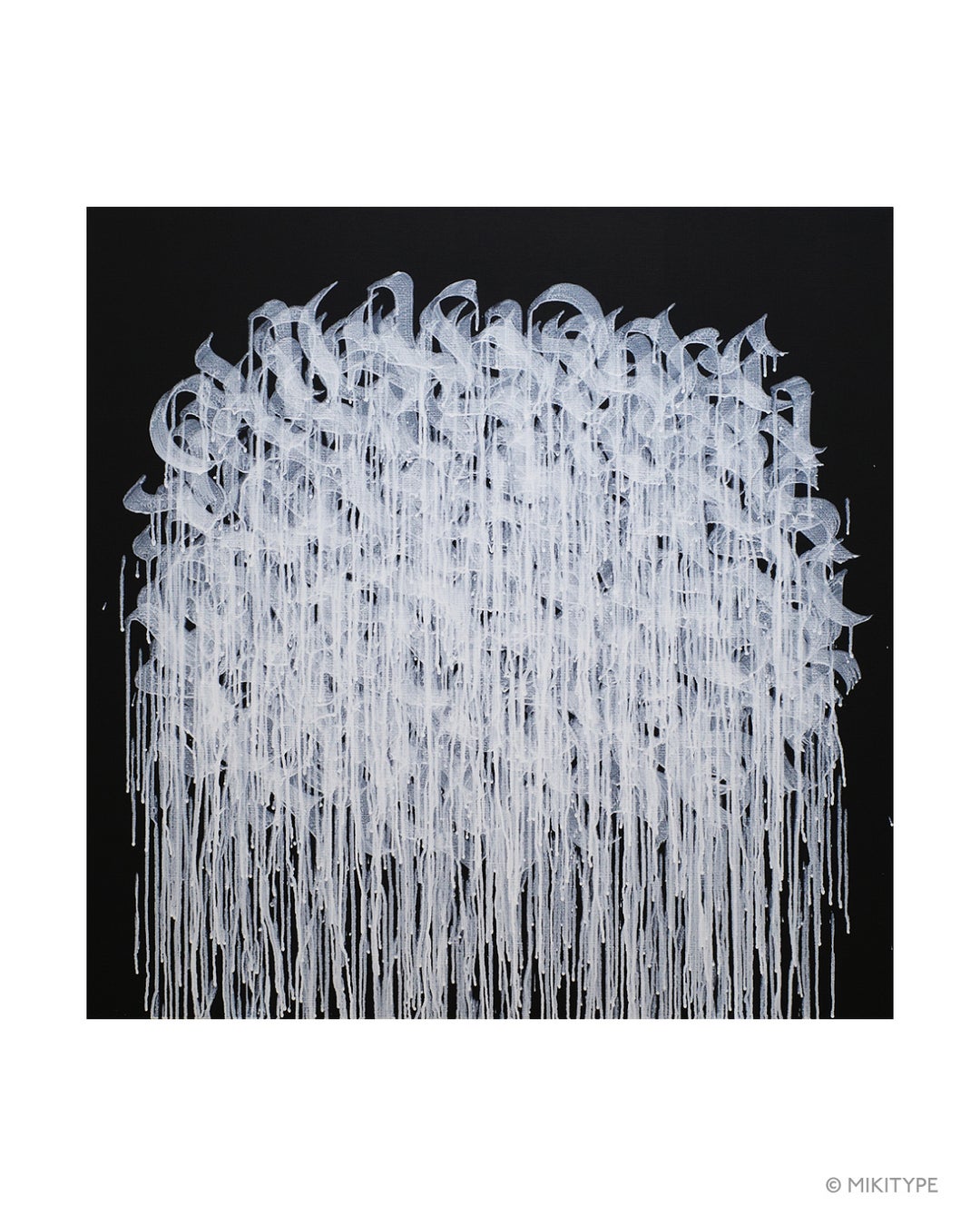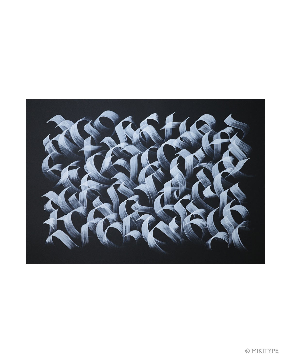 札幌生まれの彼が幼い頃に見た原風景。あたりを見渡せば一面が白い世界。草木に雪がつもり、その上に生えた葉にもまた雪が積もってゆく...。その複雑なレイヤーで構成されている風景をMIKITYPEはカリグラフィー特有の手首や腕の動き、1本のラインの中にインクの強弱を加えることだけで、極限まで筆数を減らし、描く。確かな技術に裏打ちされ、計算された繊細かつ力強い線が生み出す静寂な世界。