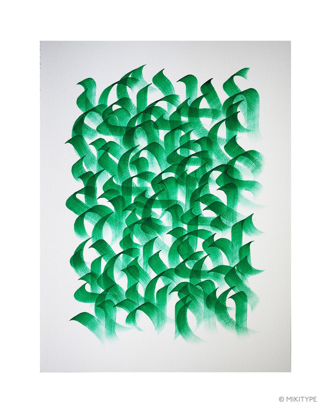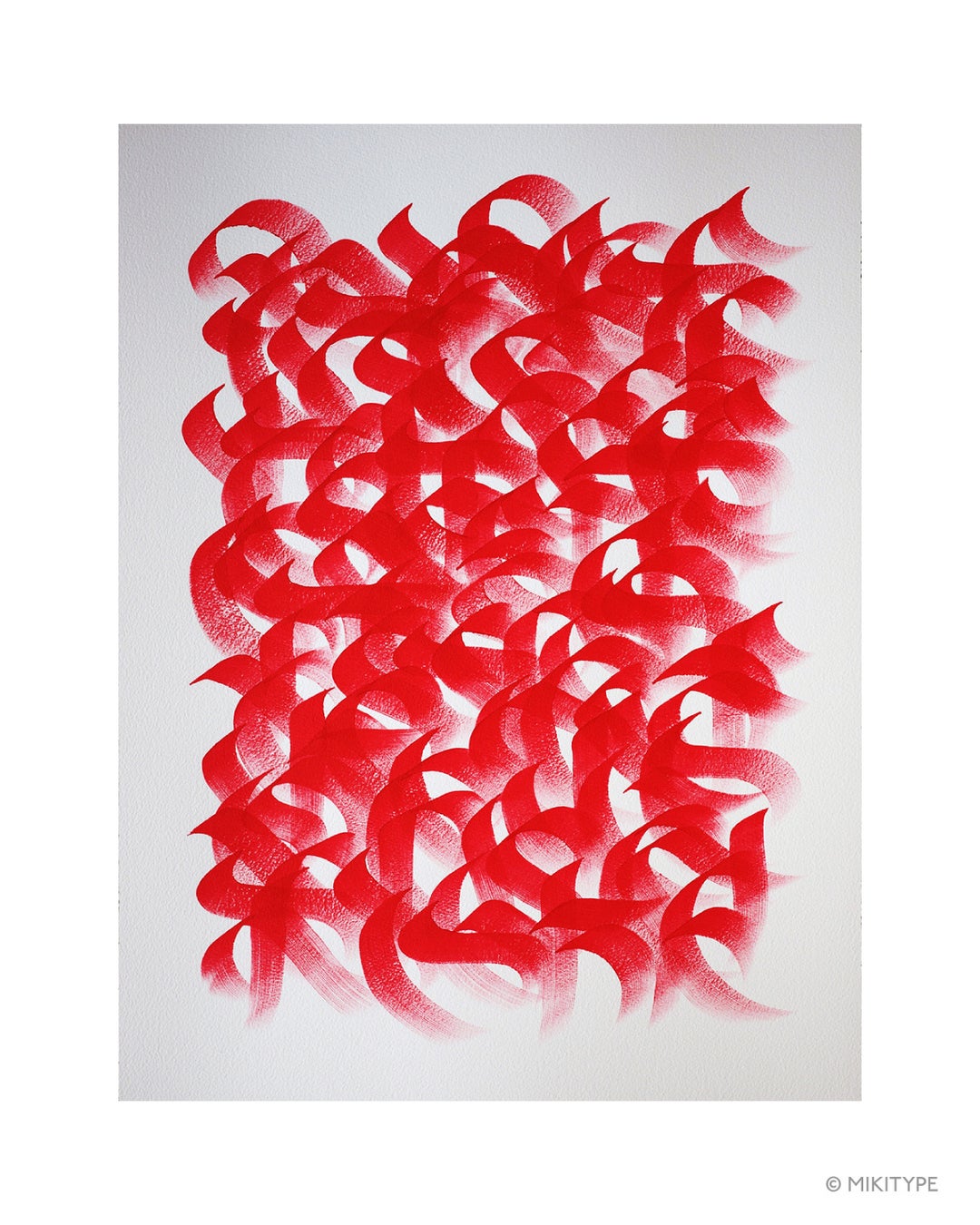 本来カリグラフィーとは、文字を装飾的にしたもので、あくまでも文字にとどまっているが、MIKITYPEはカリグラフィーの技術や筆を使う身体性はそのままに、文字という伝達手段を飛び越えて絵画として昇華させたのである。