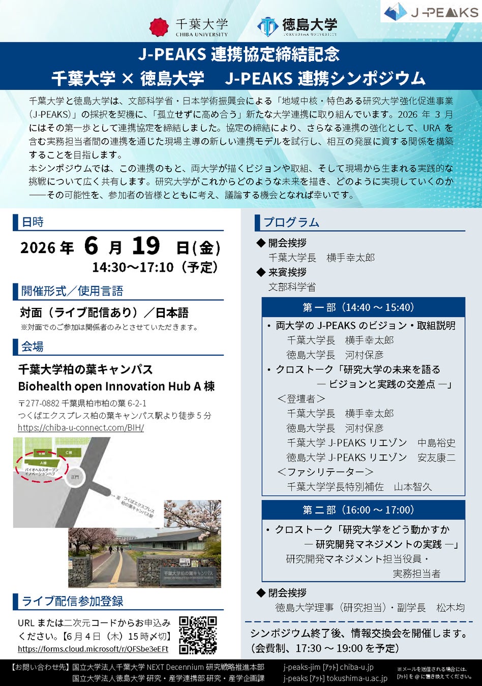 J-PEAKS 連携協定締結記念千葉大学×徳島大学 J-PEAKS 連携シンポジウム6月19日(金) 柏の葉キャンパスにて開催