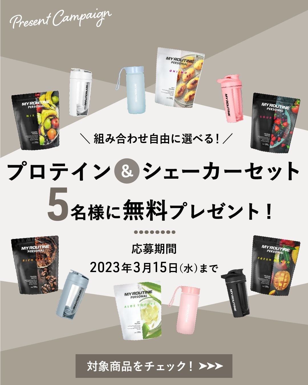 そしてプロテインユーザーによって必要不可欠であるシェーカー。今回、デザインと機能性に優れたマイルーティーン オリジナルシェーカーとパーソナルプロテインをもっと多くの方に知って頂きたく、この度プロテインとシェーカーの組み合わせを自由に選べるセットプレゼントキャンペーンを開催します。