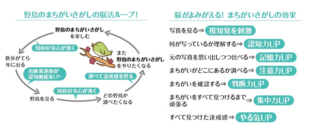 本書のまちがいさがしを1日2分でもいいので楽しんで、また野鳥についての知的好奇心を刺激し続けることで、あなたの脳は「健康脳」として活性化していくはずです。