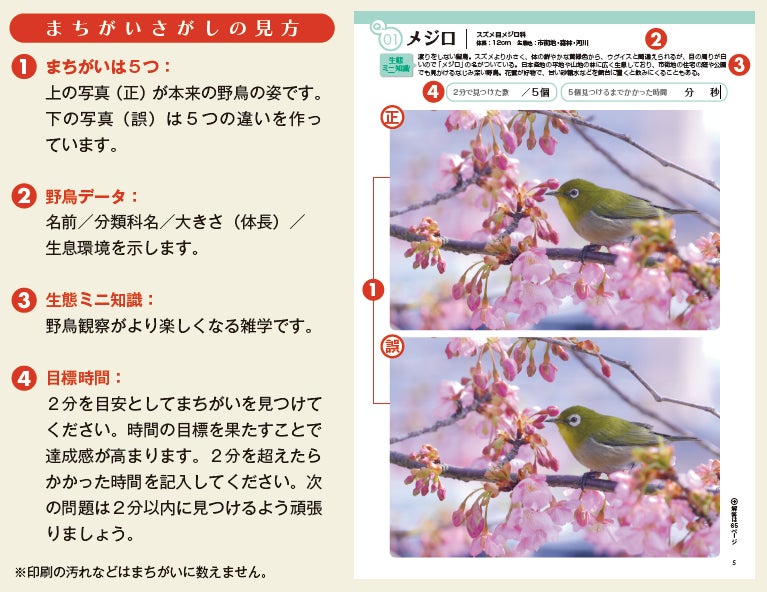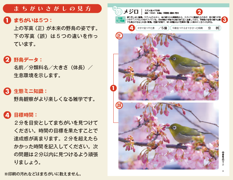 本書のまちがいさがしは野鳥の写真を使い、その生態などの知識を「ミニ情報」としてお伝えしています。名前は知っているけれど、その姿は見たことがない、逆によく見かけるけれども名前がわからない、など知っているようで知らない野鳥の視覚情報と文字情報が知的好奇心を刺激するといわれています。