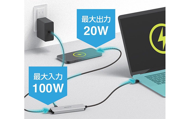 ※製品本体にて15Wを消費しますので、実際の出力は最大85Wとなります。85Wで給電が必要な場合は、100W出力の充電器をご用意ください。