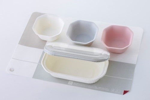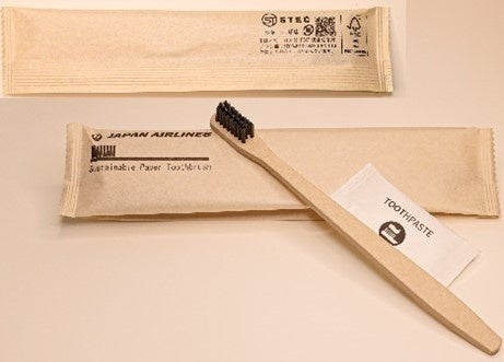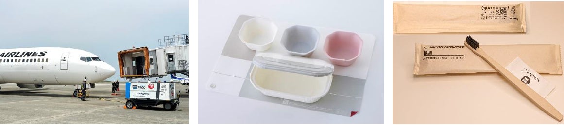 松山空港に導入したeGPU(*) 100%植物由来のエコノミークラスの JALラウンジで提供している (*)リチウムイオンバッテリー式電源装置 リユース食器(写真上3点) 紙製の歯ブラシとその包材