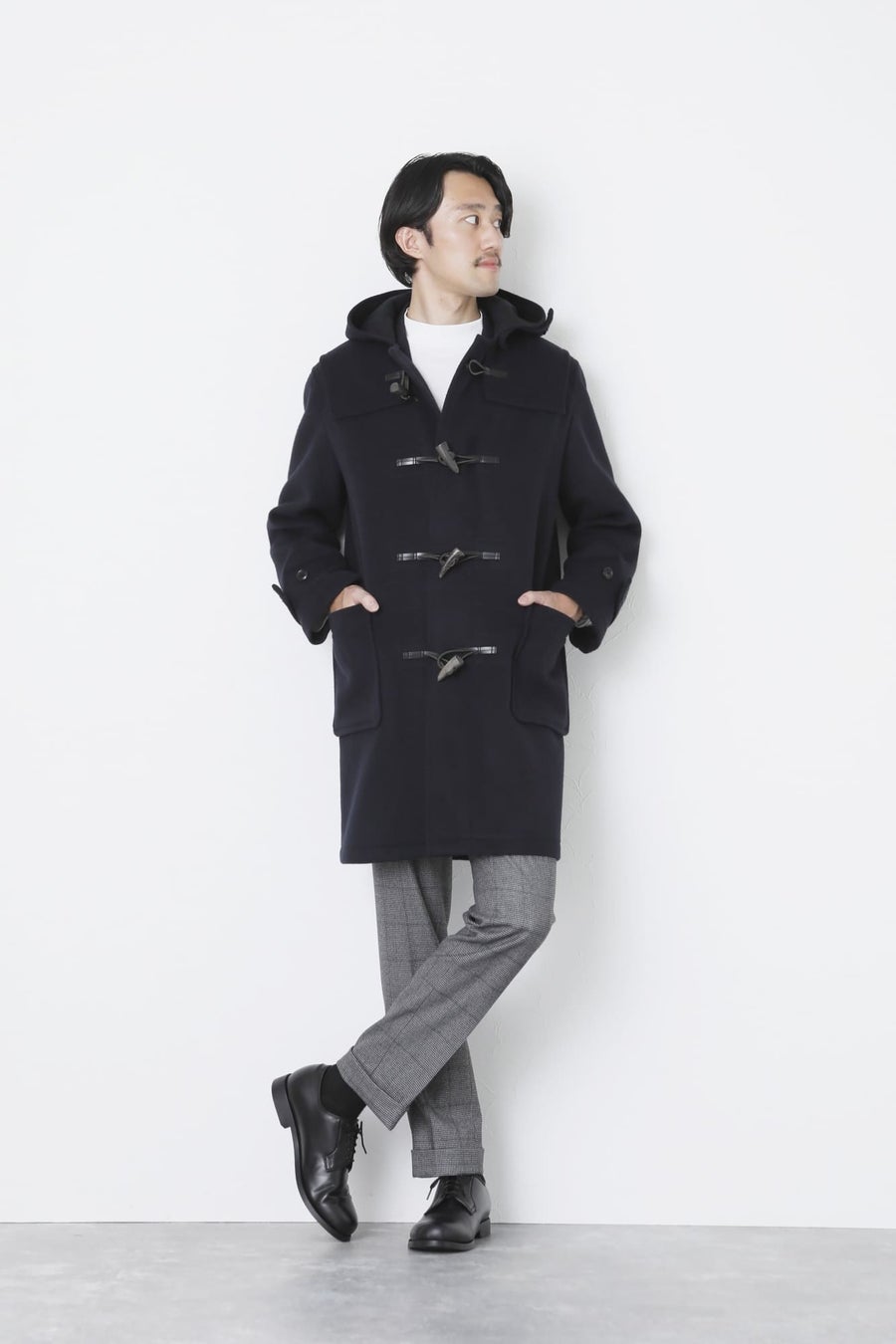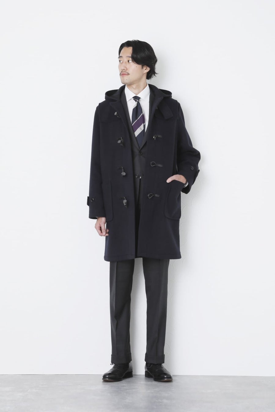 正統派グレースーツスタイルにハズしをきかせるダッフルコートをチョイス。適度にゆとりのあるサイズ感のため、ノーブルな雰囲気に仕上がります。