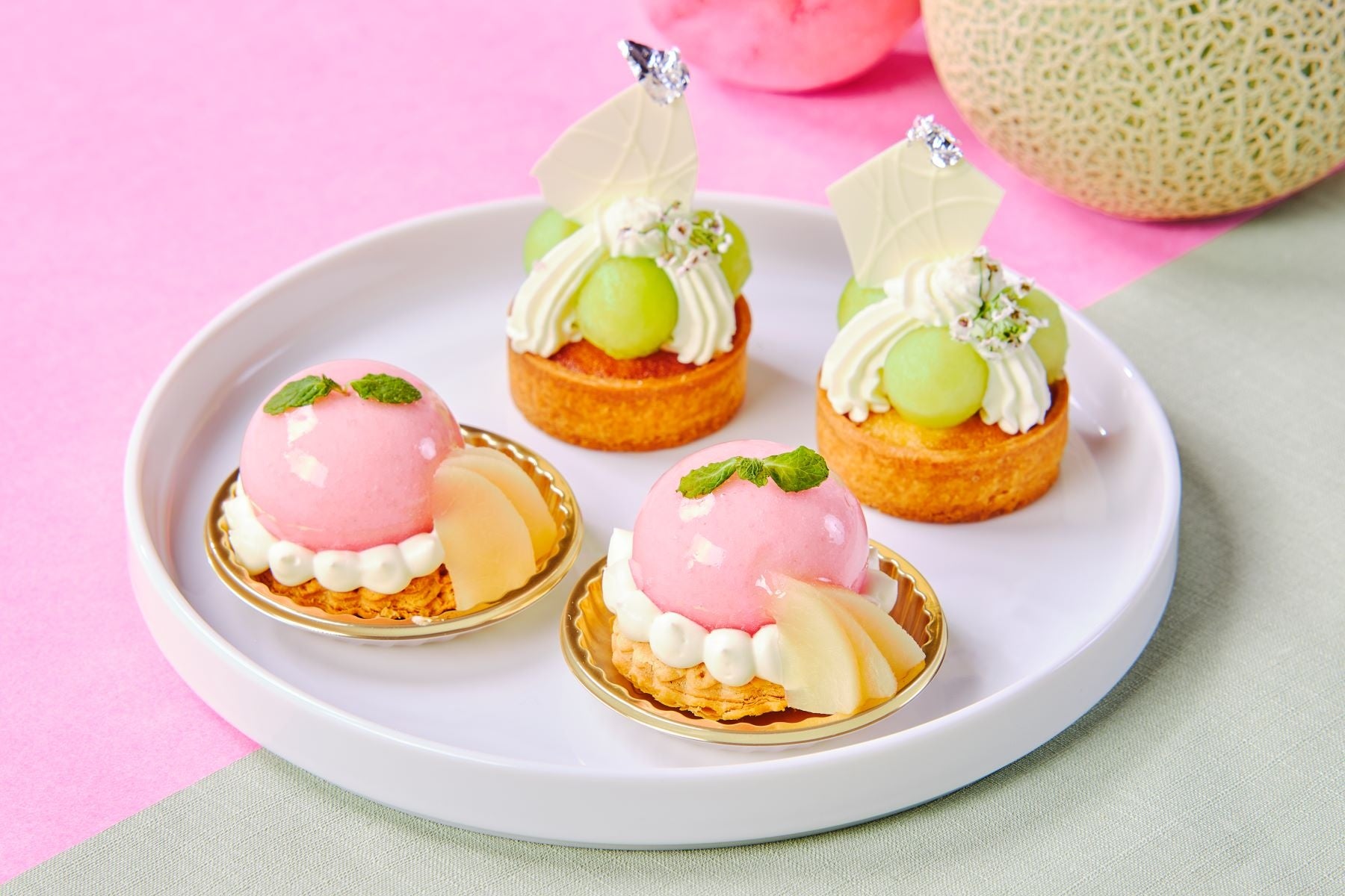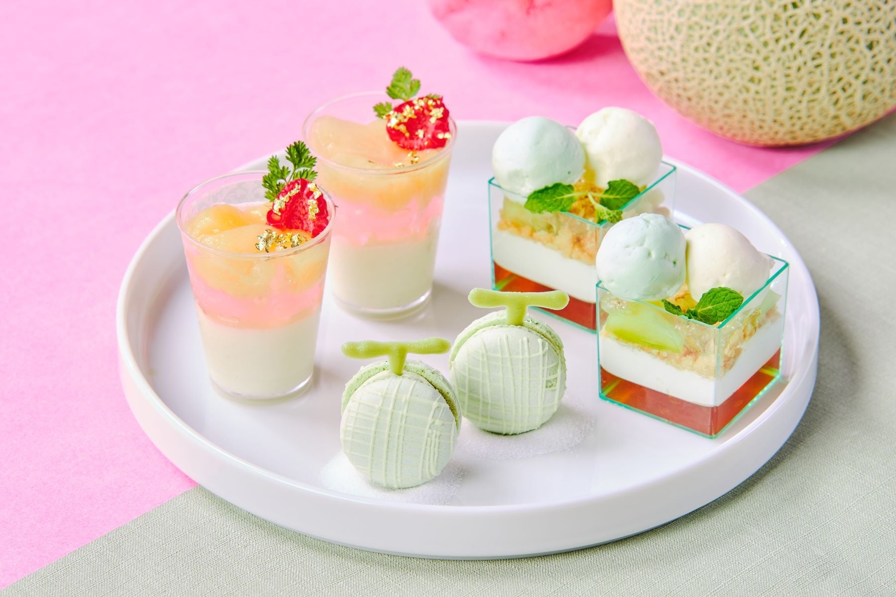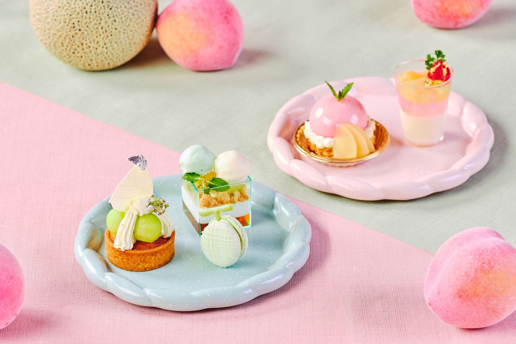 旬の桃をふんだんに使用したツヤっと輝くムースをはじめ、ジューシーなメロンの果実溢れるメロンタルト、プルンとしたジュレとふわりと香るミントのパンナコッタが相性抜群の桃ジュレとミントのパンナコッタ、コロンとしたフォルムが可愛いメロンマカロンを提供します。他にも、メロンの果実やジュレ、メロンシャーベットにクランブルのサクサク食感を楽しめる紅茶香るメロンパフェなど旬のフルーツ“桃”と“メロン”を贅沢に使用した、一つ一つにこだわったスイーツをご賞味できます。