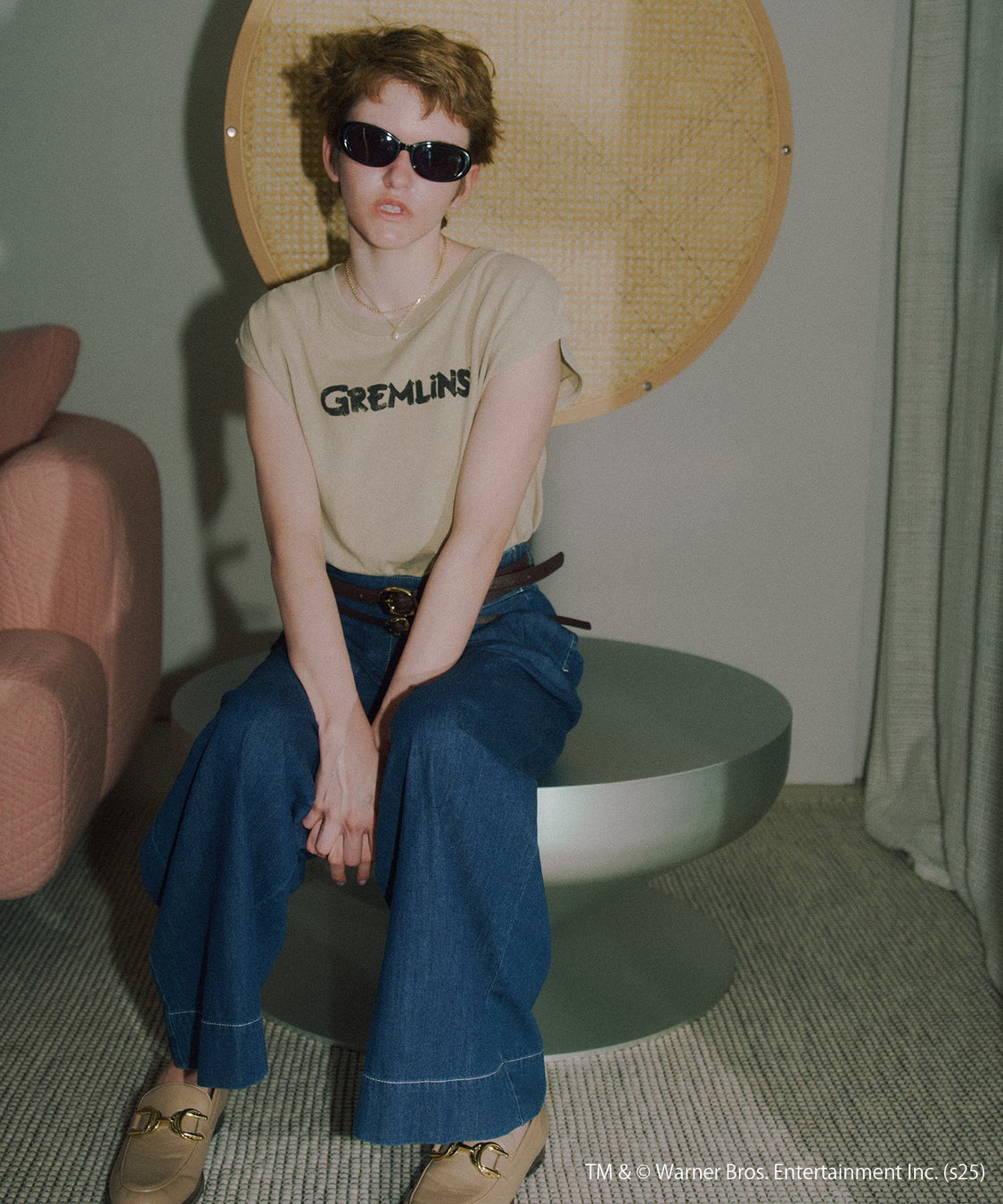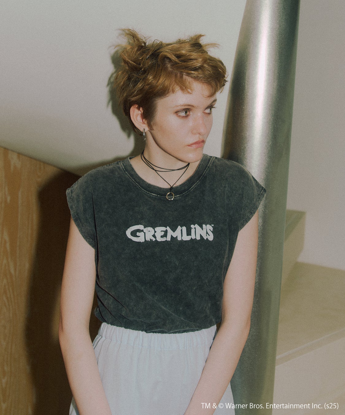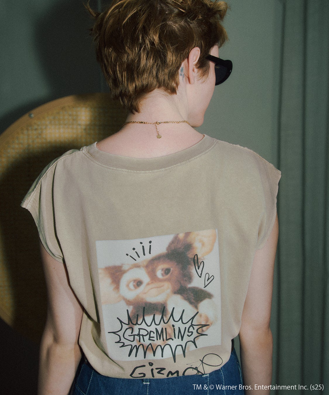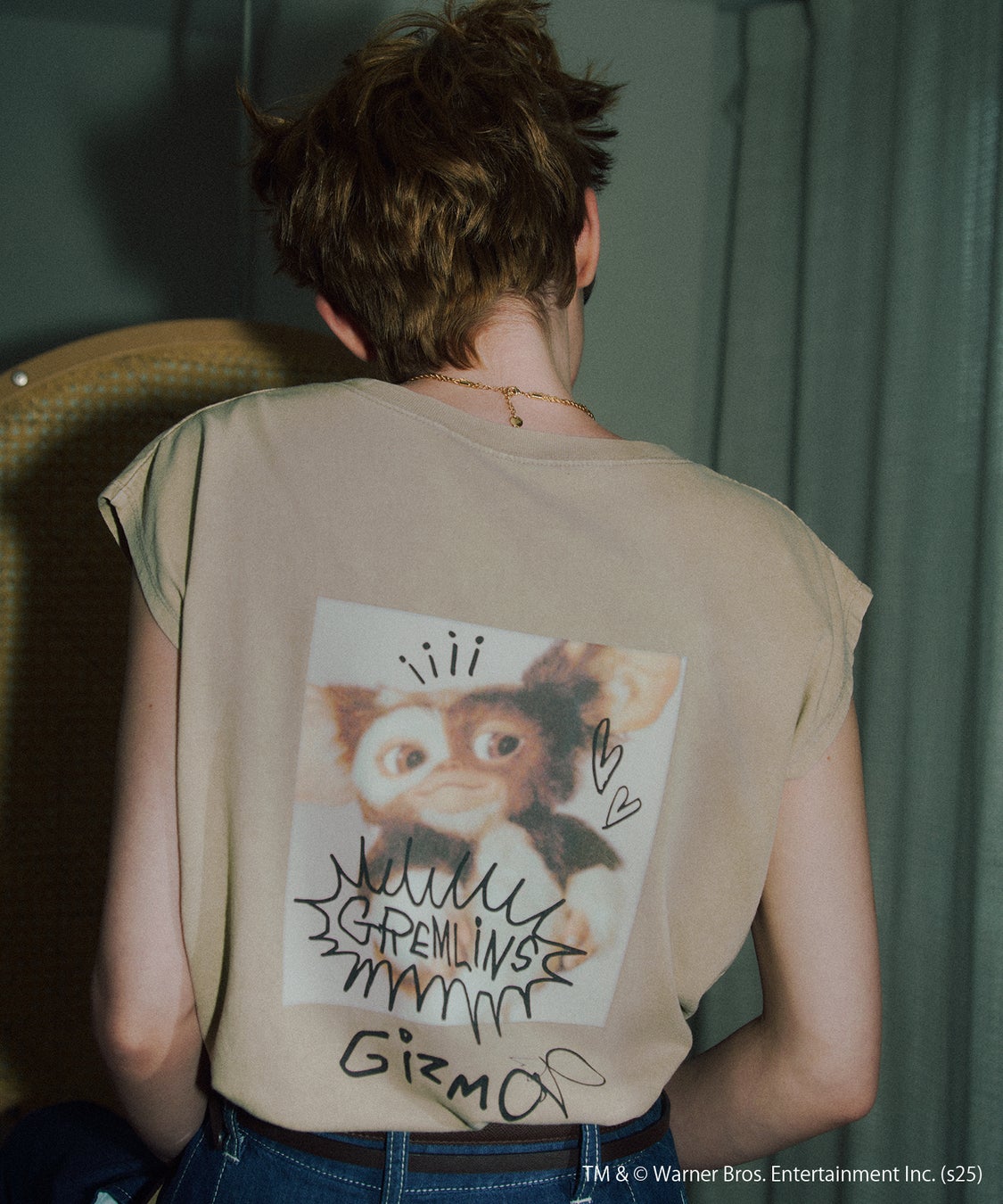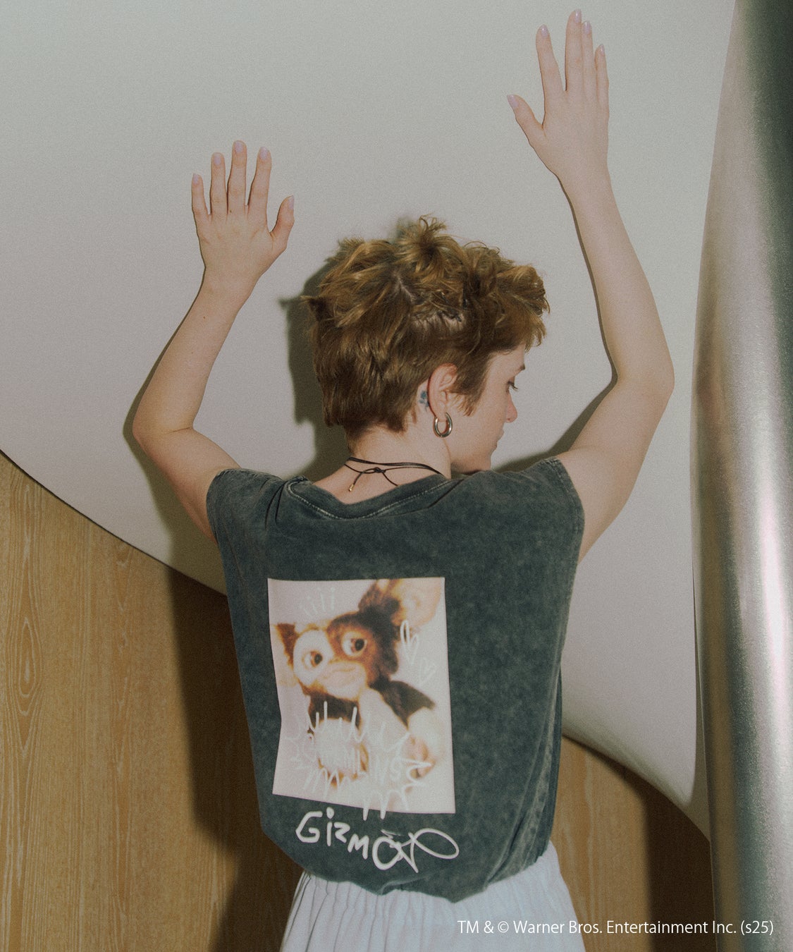 フロントはロゴ、バックにはギズモのフォト風プリントといたずら書き風の手描きレタリングがアクセント。フレンチスリーブとアシッドウォッシュ加工で、大人カジュアルにぴったりな一枚。