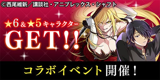 今回のコラボ召喚では、「★6 忍野忍」「★6 斧乃木余接」「★6 千石撫子」「★6 八九寺真宵」「★6 羽川翼」「★5 戦場ヶ原ひたぎ」「★5 神原駿河」が登場します。