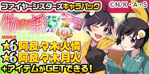 購入すると、強化されたコラボキャラクター「★6 阿良々木火憐」もしくは「★6 阿良々木月火」と育成アイテムの「マスターベリー」「人輝幻晶」が1つずつ、クエストに役立つ「回復薬交換券」が2つ獲得できます。