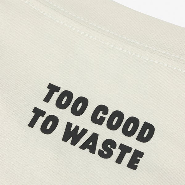 TOO GOOD TO WASTE(=もったいない)のロゴが背面に入ったデザイン、前身はピスネーム付。ソフトな肌あたりの天竺素材のショートスリーブクルー。リラックスシルエットでアクティブに動くシーンやデイリーユースまでマルチに活躍するアイテムです。
