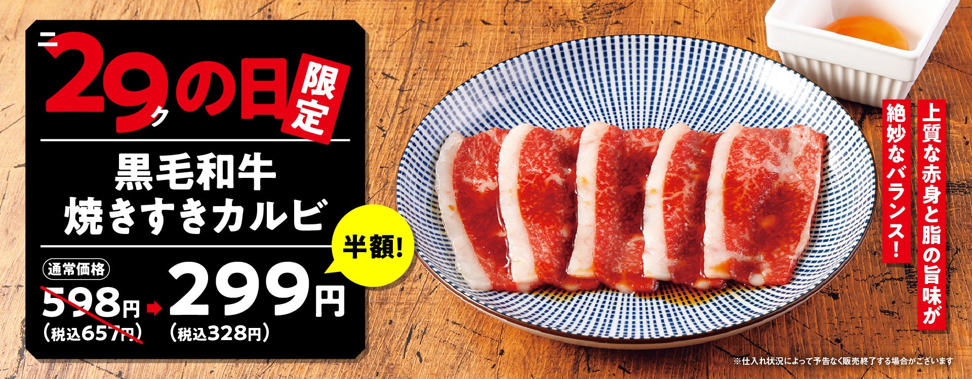 ◆対象商品・価格:「黒毛和牛焼きすきカルビ」が何皿食べても1皿税込328円 ※仕入れ状況によって予告なく終了する場合がございます。