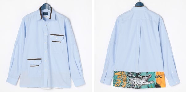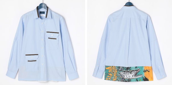 正面には大きめのフラップ付きパッチポケットをアシンメトリーに配し、背面の下部には魚をモチーフにしたダイナミックなイラストがプリントされたデザインが目を引く一着。襟の内側とポケットには茶色のパイピングが施され、ふとした瞬間に見えるこのラインが、全体のデザインに統一感を与えています。ビジネスウェアとストリートアートの感性が融合しています。