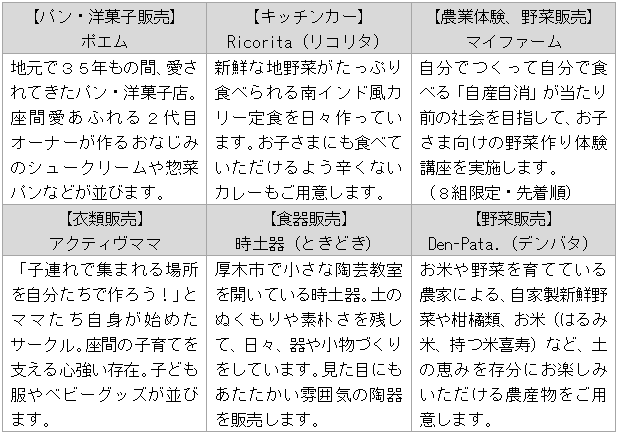 本イベントでは、座間市「ひまわりグルメ選手権」を3連覇した洋菓子店「ポエム」のシュークリームや周辺地域の地野菜の販売、これをたっぷり使ったカレー、手作り雑貨の物販など約30店が出店するマルシェを開催します。また、同会場にある農園では、お子さま向けにさつまいも掘り体験(8組限定・先着順)もご用意しており、地域間での交流を促進します。