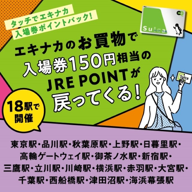 JRE POINTに登録したSuicaを利用して対象駅で「タッチでエキナカ」にて入場し、対象店舗でお買いものいただき同一駅の自動改札機を出場すると、入場券額相当の150ポイントをポイントバックいたします。