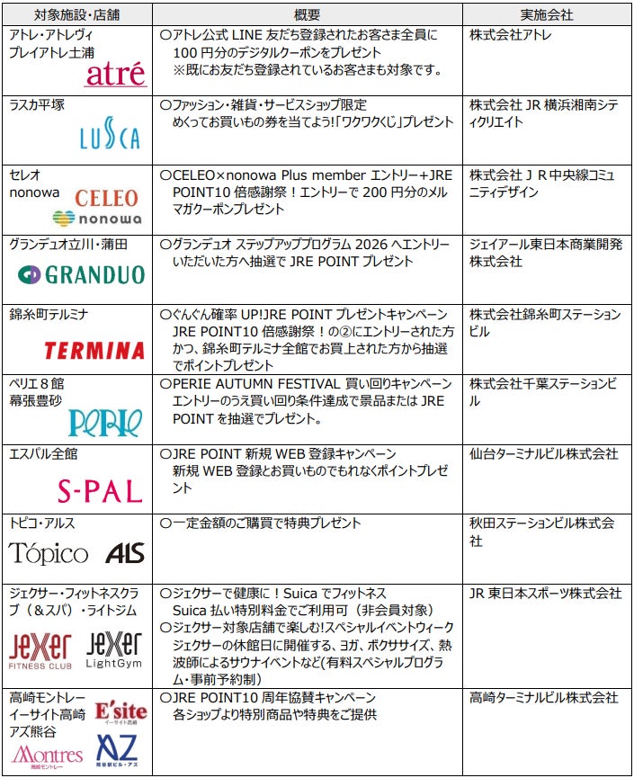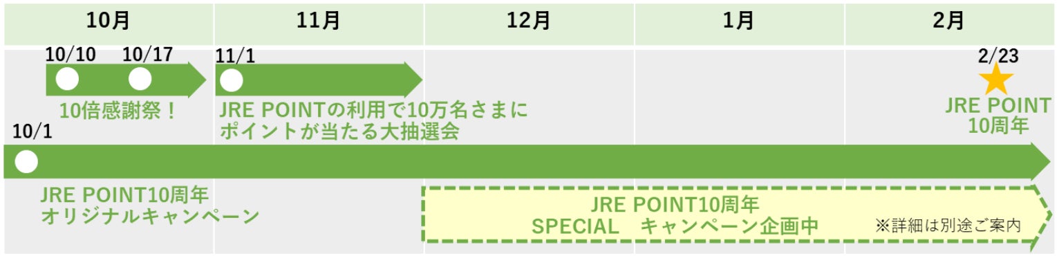 お客さまへの感謝の気持ちを込めて、JRE POINTを貯めて使えるおトクなキャンペーンを開催します。各キャンペーンの詳細については「JRE POINTありがとう10周年特設サイト」にて順次お知らせします。10周年を迎える2026年2月23日に向けて続々とキャンペーンを開催しますので、ご期待ください。