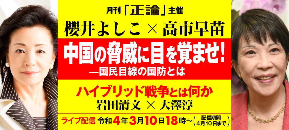 月刊「正論」(産経新聞社発行)は、シンポジウム「中国の脅威に目を覚ませ!~国民目線の国防とは」を、3月10日(木)18時からライブ配信します(※4月10日までアーカイブ配信)。