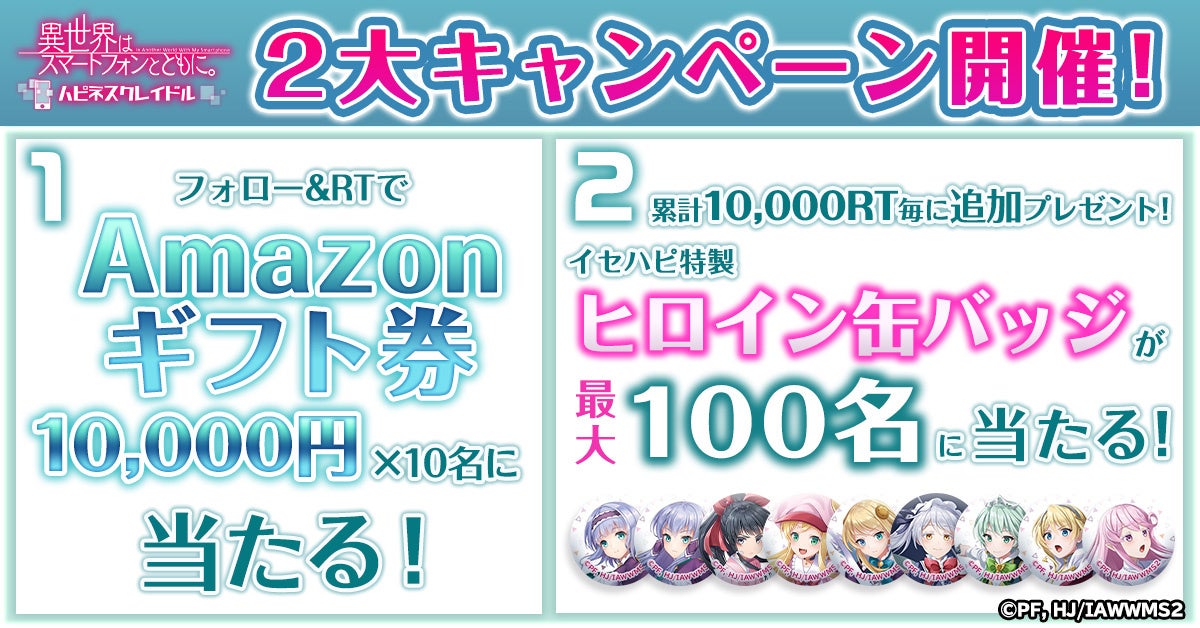 「イセハピ」公式Twitterでは、フォロー&リツイートキャンペーンを実施中です。抽選で10名様にAmazonギフト券1万円分、最大100名様にイセハピ特製缶バッジをプレゼントいたします。キャンペーンには毎日参加が可能で、以降も様々なキャンペーンを実施してまいりますので、ぜひ公式Twitterのフォローをお願い致します。