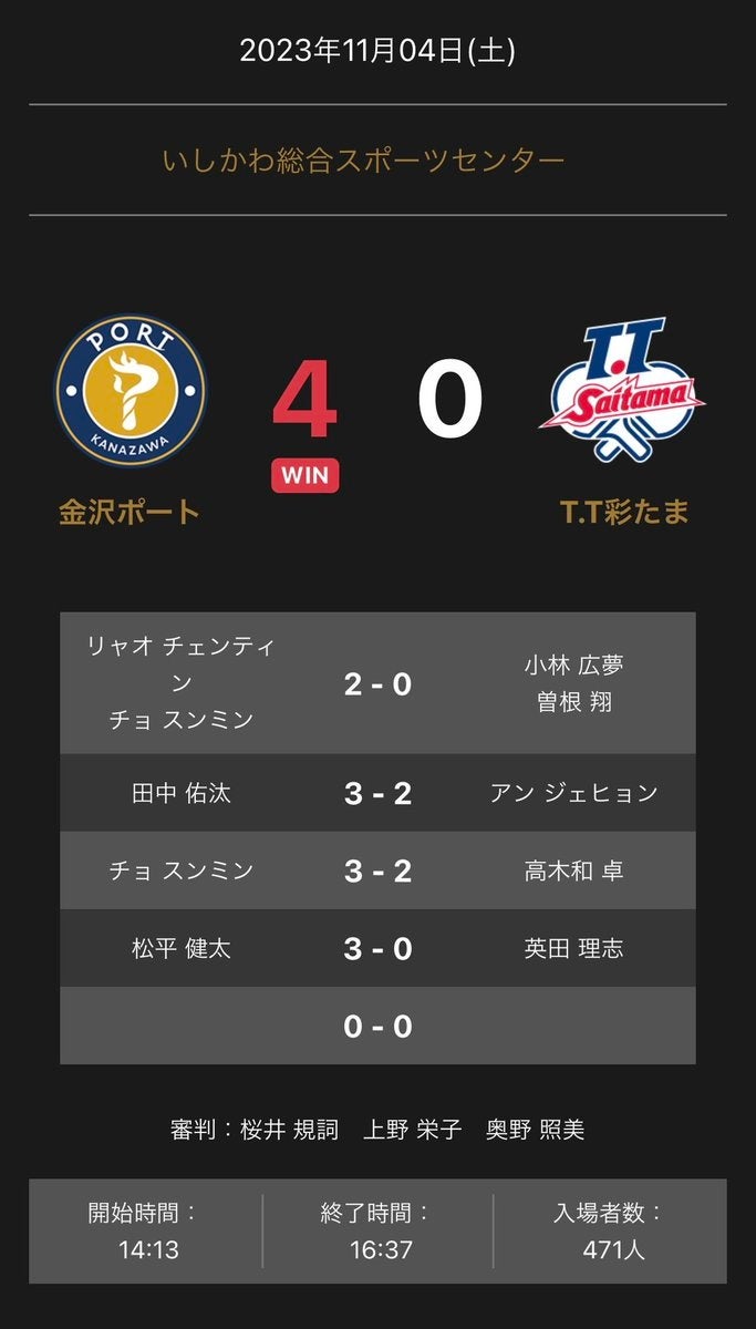 ノジマTリーグ2023-2024シーズン公式戦 11月4日(土)14:00試合開始 金沢ポート vs T.T彩たま 試合結果
