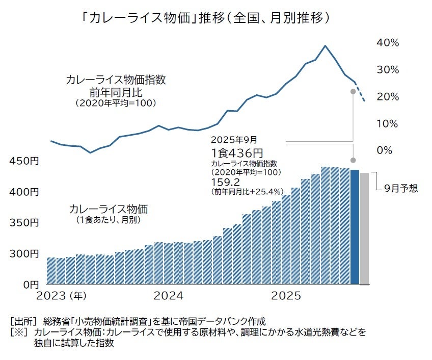 2025年8月のカレー物価1食436円 最高値から5円安 9月は前月比5円安の1食431円予想、5年ぶりの下げ幅に「コメ価格」の安定寄与