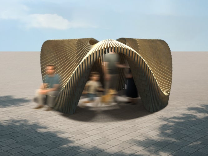 老朽化が進む街路樹をマテリアルとしての木材ととらえ、都市における大きな循環の中に位置付けるための一時的なストックのあり方を考えた。3つの部材をねじり嚙み合わせたリングによって水平方向の広がりのみを拘束するこの小さな架構形式は、運搬・組立・分解が容易であり、しかも部材の一部を取り去っても全体の形状を維持することが可能である。公共への貢献と個人の都市体験が交わる場所に、新たなDigi Fabの意義を見つけた。