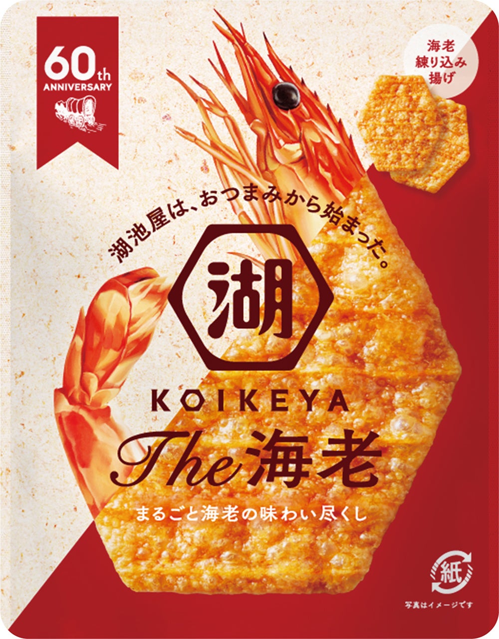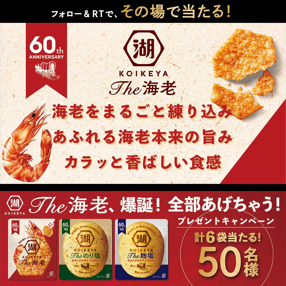 そしてこの度、当シリーズの次なる商品として、創業当時に製造していた“海老せん”を元に、長年培った独自の技で進化して生まれた「KOIKEYA The海老」を2022年5月30日(月)より全国コンビニエンスストア・湖池屋オンラインショップ、2022年6月27日(月)より全国スーパーマーケット等一般チャネルにて発売します。