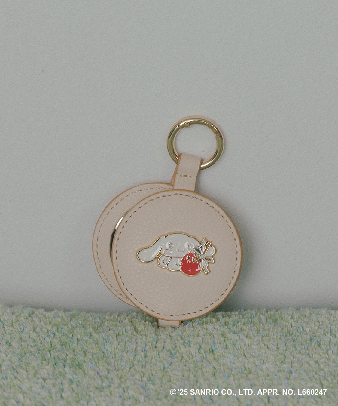 大きなチェリーとリボンを付けたシナモロールがポイントのチャーム型ミラー。スナップ開閉式でミラーを保護し、バッグに付けられるカラビナ付き。持ち歩きたくなるビジュアルです。