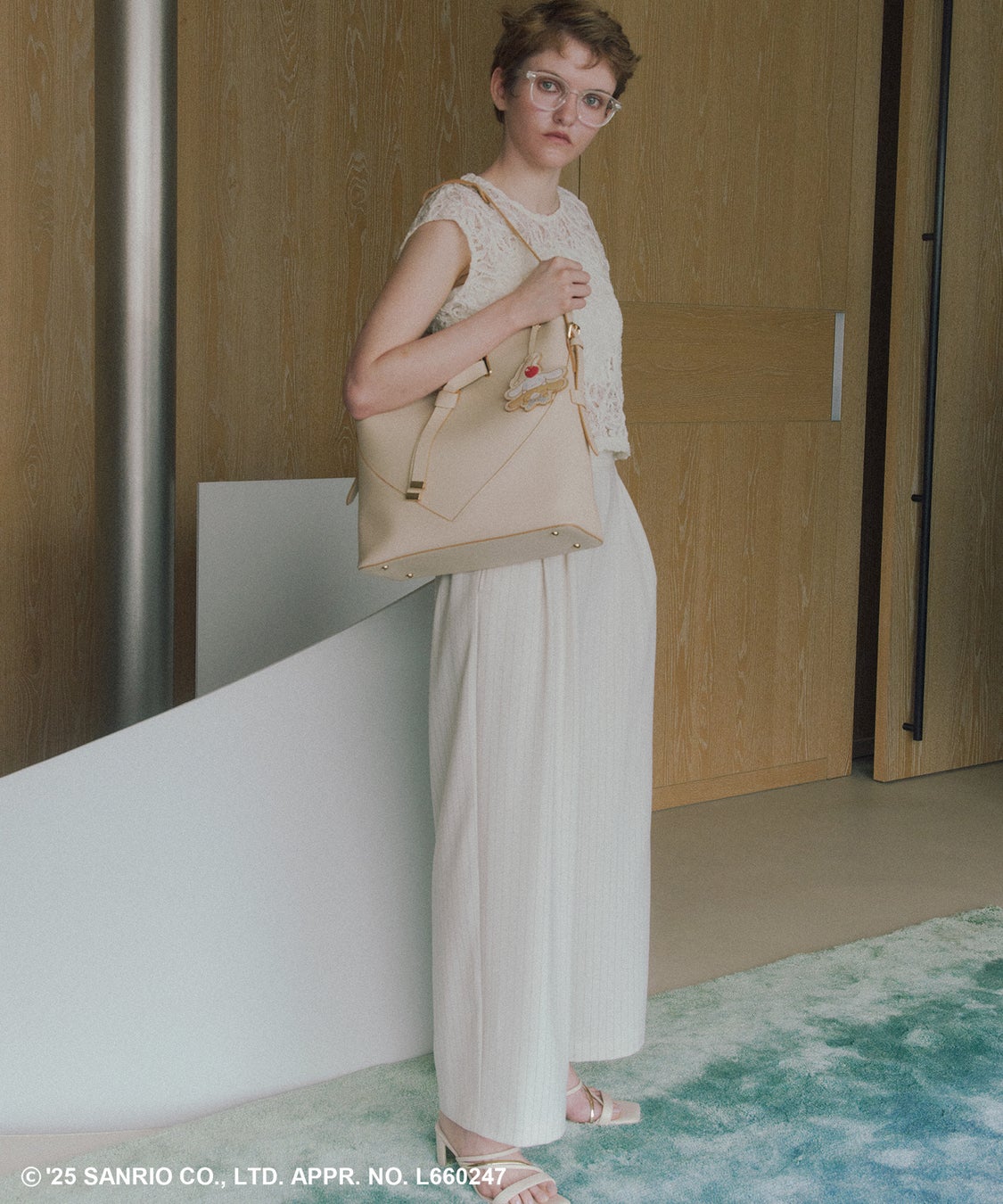 A4や13インチPCも入る、容量たっぷりのLサイズ。VIS限定アートのチャーム(シナモロール&カプチーノ)は内側に収納すれば通勤にも◎。軽量設計で肩あて付き、荷物が多い日でも安心。マグネットは2箇所で、荷物の量に応じて調整可能。シナモロールとお友だちのカプチーノをイメージしたライトベージュカラーが上品。