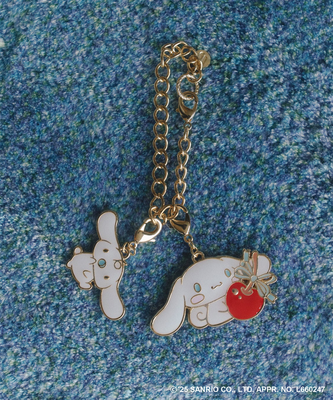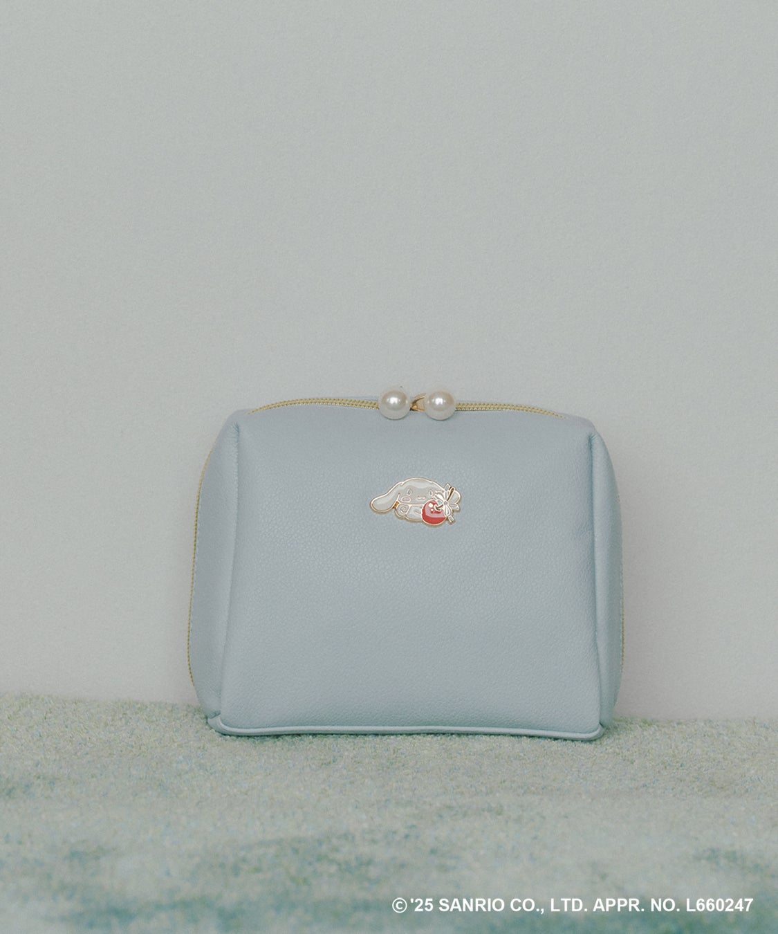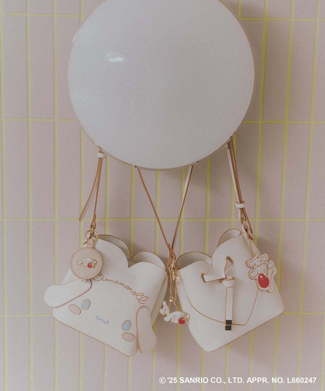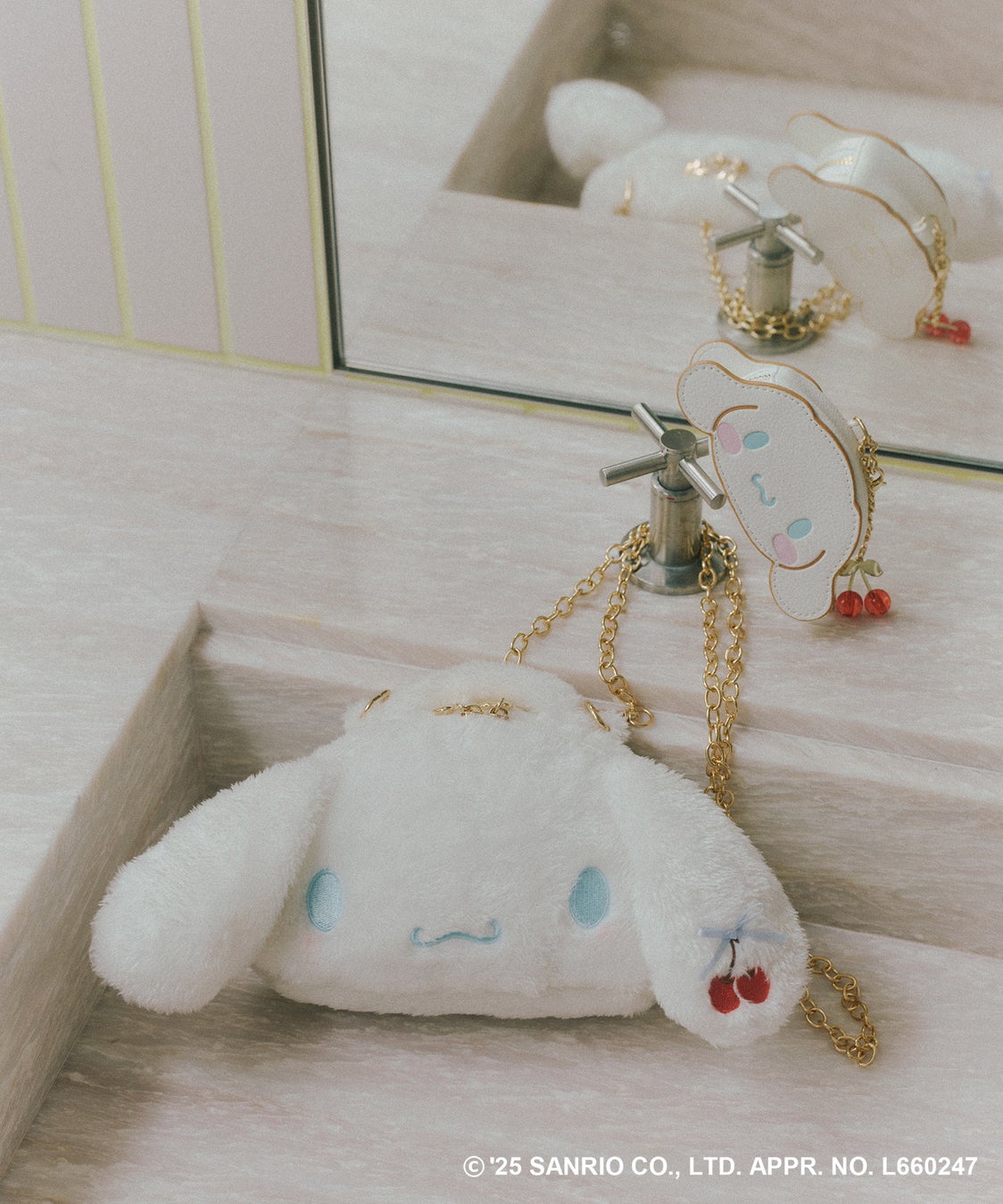 おすまし顔のシナモロールがそのままチャームに。AirPodsやリップが入る実用サイズ。チェリーの揺れるチャームと、ギンガムチェックの内装がポイント。※一部店舗限定アイテム