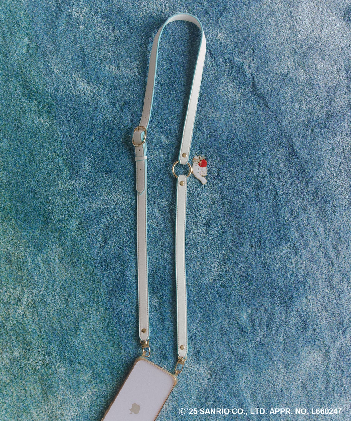 ショルダーとハンドストラップ、2WAYで使える便利なアイテム。オフホワイト×ブルーの配色に、シナモロールのチャーム付き。カラビナでチャームの付け替えも自由自在。旅先やお散歩にもぴったり。