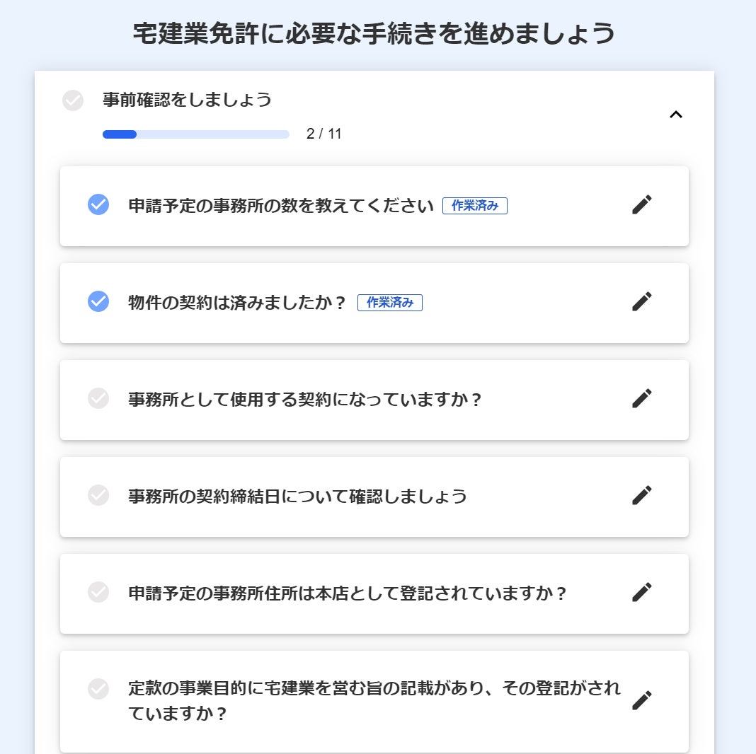 PCやスマートフォンから入力フォームの質問に答えていくだけで宅建業免許取得に必要な書類を自動で作成できます。また、宅建業免許取得の手続きに必要な手順や書類もわかりやすくガイド表示されるため効率的な情報収集が可能です。