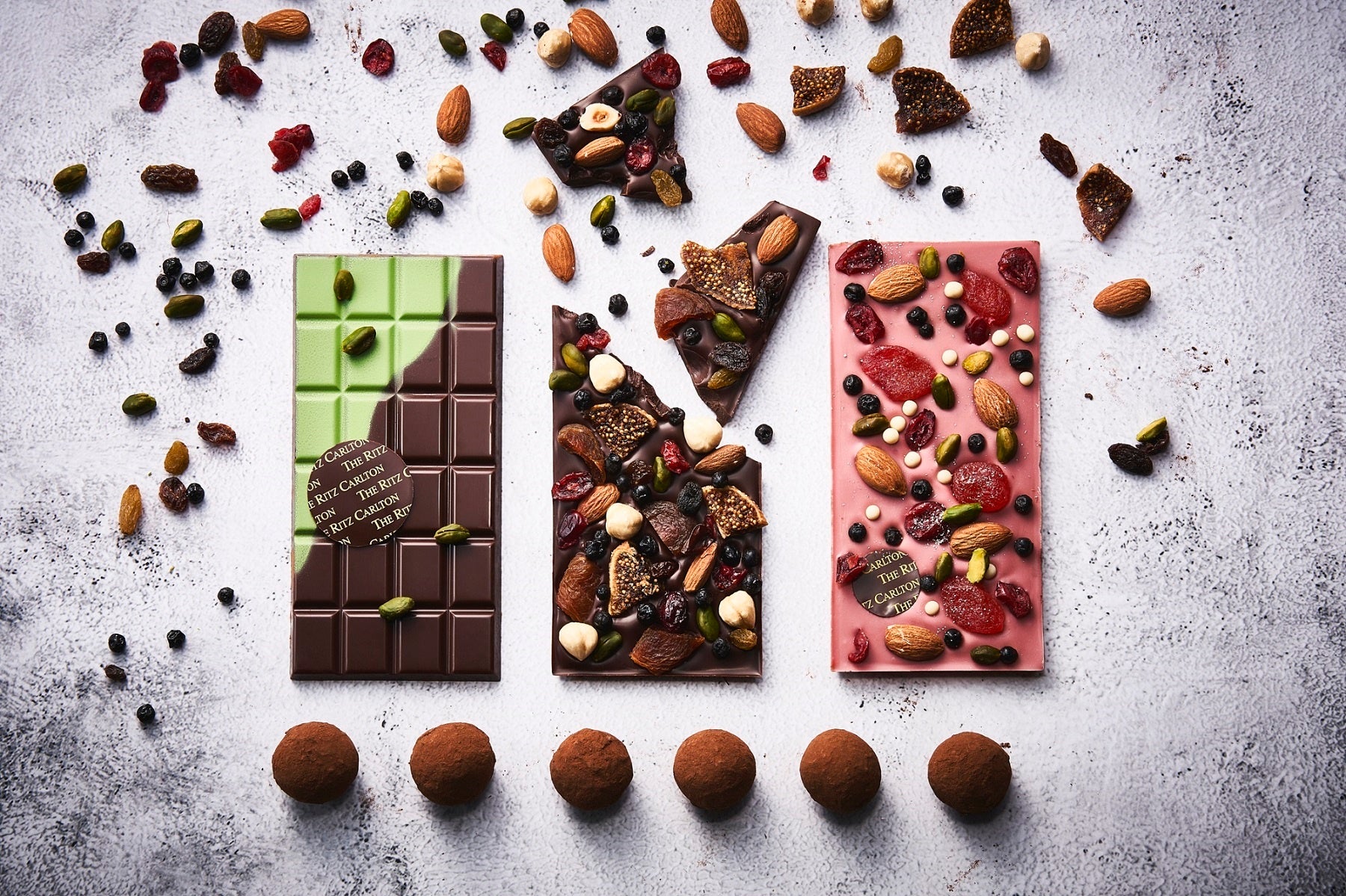 専属のショコラティエが丁寧に手作りする定番の人気商品。(写真左から)ピスタチオ、マンディアン、ルビーの3種をご用意しました。