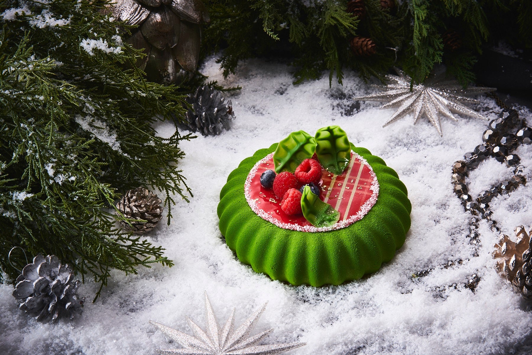 風味豊かなピスタチオムースの中に、ピスタチオのビスキュイ、ラズベリーコンフィ、バニラクリームの3層がバランス良く調和。オーナメントをイメージしたチェック柄のトップに、チョコレートで作ったリーフやラズベリーを飾った華やかな一品。