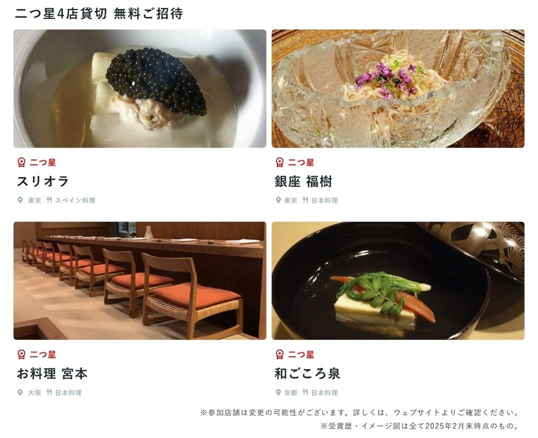 第1回は、東京・京都・大阪から二つ星獲得店を中心とした4店舗(※3)に無料でご招待(※4)します。