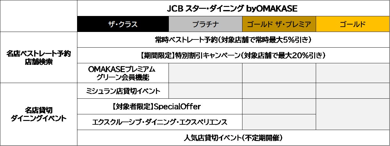 「JCB スター・ダイニング by OMAKASE」では、エリア、日付、ジャンル、キャンペーン実施有無等の条件で検索できるほか、クラス会員限定でOMAKASEプレミアムグリーン会員(※2)の機能を無料で提供し、さらに機能をより活用しやすくなる一括お気に入り登録機能やお一人おひとりのアンケート結果に応じて選りすぐりの店舗をお勧めする機能なども追加いたします。