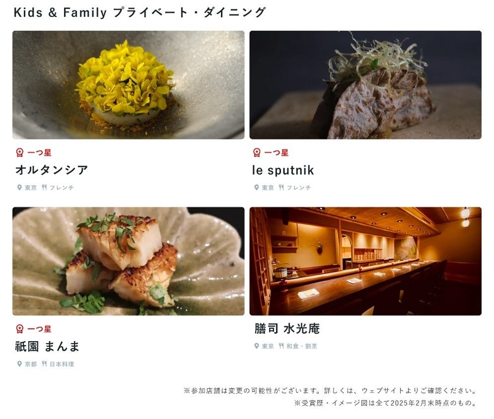 また、「エクスクルーシブ・ダイニング・エクスペリエンス」では、ザ・クラス/プラチナ会員限定で、名店貸切ダイニングイベントを実施します。第一回は、先着申込制のKids & Family プライベート・ダイニングを開催します。一つ星獲得店舗を筆頭に、お子様連れの方に気軽にご来店いただける貸切イベントで、一部店舗では、お子さま専用コースなど、本イベントならではの特別対応もご用意しております。人気の企画は今後の継続実施も検討してまいりますので、奮ってご参加ください。対象の方へは、別途EDMやMyJCB内等にて詳細のご案内をいたします。