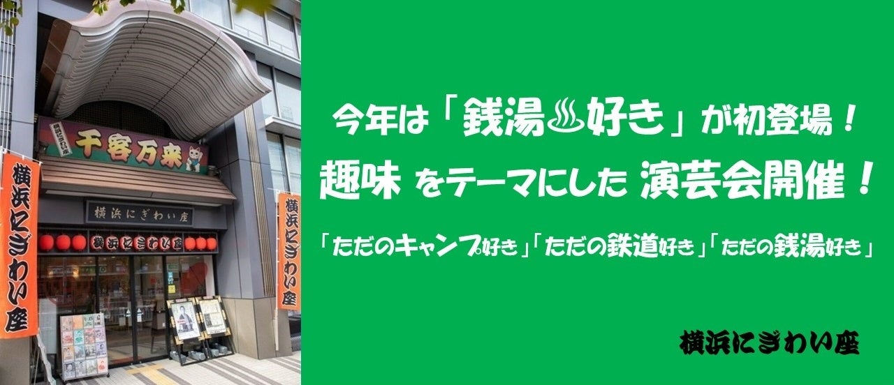 横浜にぎわい座では、さまざまな切り口から大衆芸能をお楽しみいただくため、趣味をテーマにした演芸会を開催しています。これまで好評だった「キャンプ」「鉄道」に加えて、今年は「銭湯」が初登場!