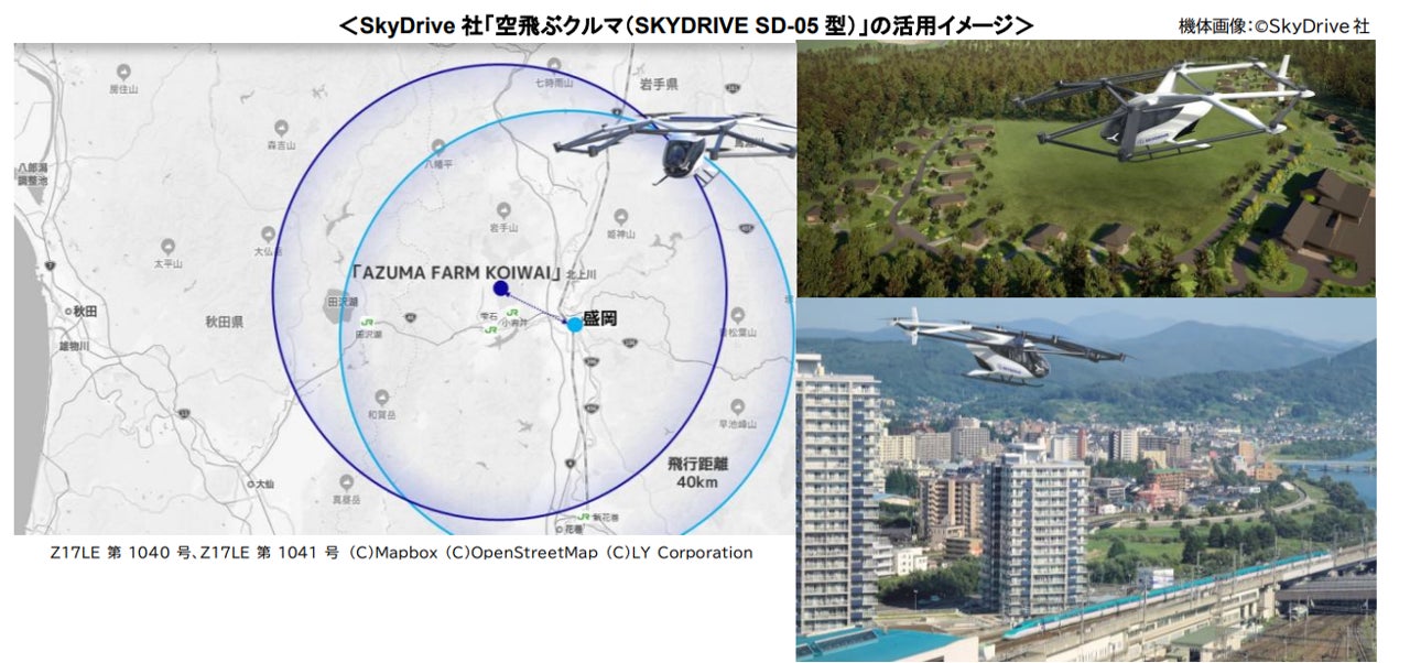 新しいモビリティ体験として、SkyDriveの「空飛ぶクルマ」を活用し、盛岡~ホテル間の送迎、ホテル・周辺観光のツアー等を検討しておりますが、出資を経てさらに両社の連携を強化し、具体的な航路や離発着場などの詳細の検討を加速していきます。