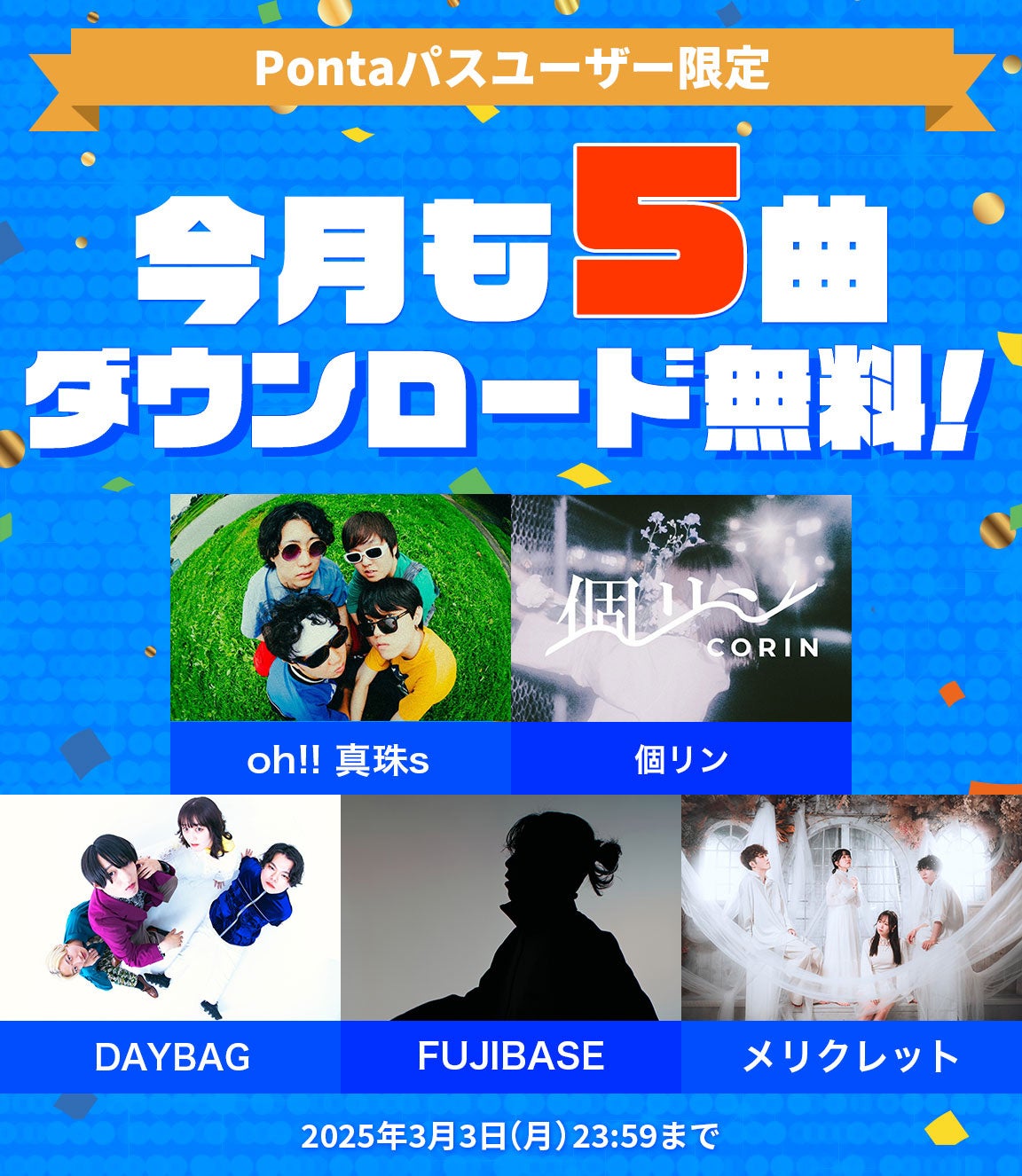KDDIは、約1,500万人が利用しているおトクなサブスクリプションサービス「Pontaパス」(月額548円)会員の特典として、2025年2月11日10時から3月3日23時59分までの期間限定で、oh!! 真珠s「誰も知らない」、個リン「Mirror Ball」、DAYBAG「アイリス」、FUJIBASE「smoke and mirrors」、メリクレット「葵月だって泡沫」を無料ダウンロードいただけます。今回は1月21日から実施している「あげすぎチャレンジ第2弾」キャンペーンの1つとして、通常は毎月1~2曲を無料ダウンロードのところ、5アーティスト同時に増曲して期間限定無料ダウンロードキャンペーンを実施しています。