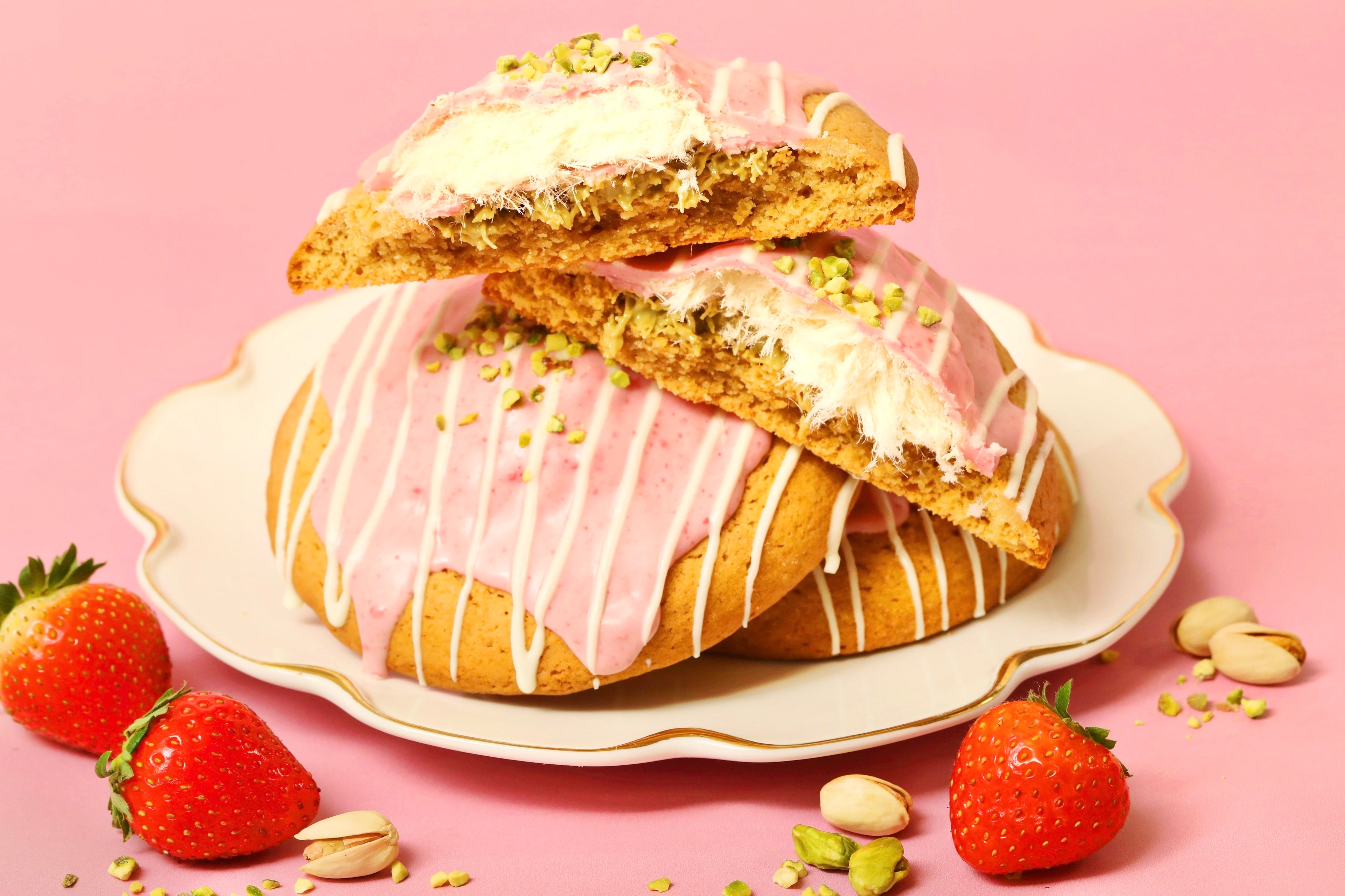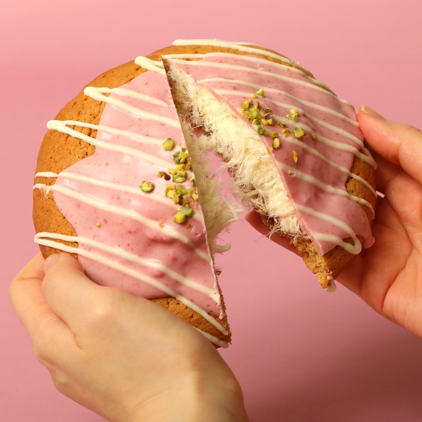 しっとりほろほろ食感のクッキー生地に、注目のピシュマニエ、ローストしたカダイフ、香ばしいピスタチオソースを重ねて焼き上げました。口に入れた瞬間にすっと溶けるピシュマニエに、“ドバイチョコ”特有のバリバリ・ザクザク食感を一緒に楽しめるハイブリッドスイーツです。1枚1,100キロカロリー超えで、なんとも“ギルティー”!