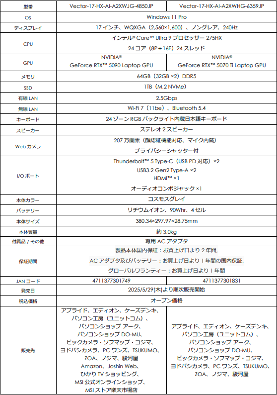 この度、エムエスアイコンピュータージャパン株式会社は、eスポーツゲーマー向け17インチゲーミングノートPCとして性能と機能を追求したウルトラハイスペックモデル「Vector 17 HX AI A2XW」シリーズを2025年5月29日(木)より順次発売いたします。