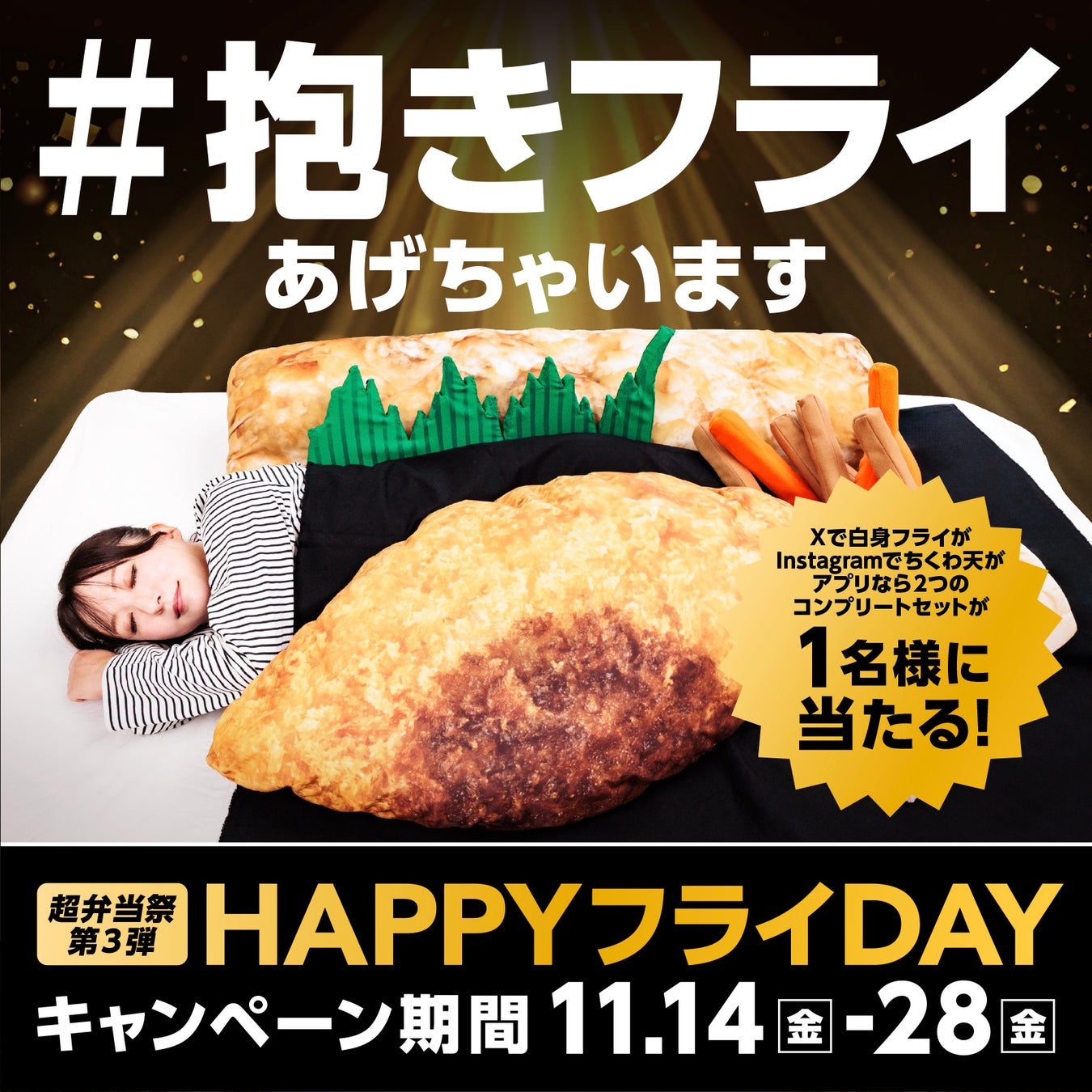 第三弾は、「HAPPYフライDAY」と題し、「ほっともっと」の人気フライの巨大クッションなどの豪華賞品をプレゼントいたします。奮ってご参加ください。