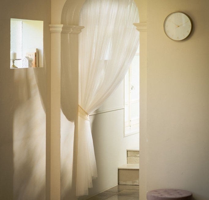 やさしいチュール生地の間仕切りカーテン。突っ張りポールに通すだけで、お部屋の雰囲気を変えることができます。