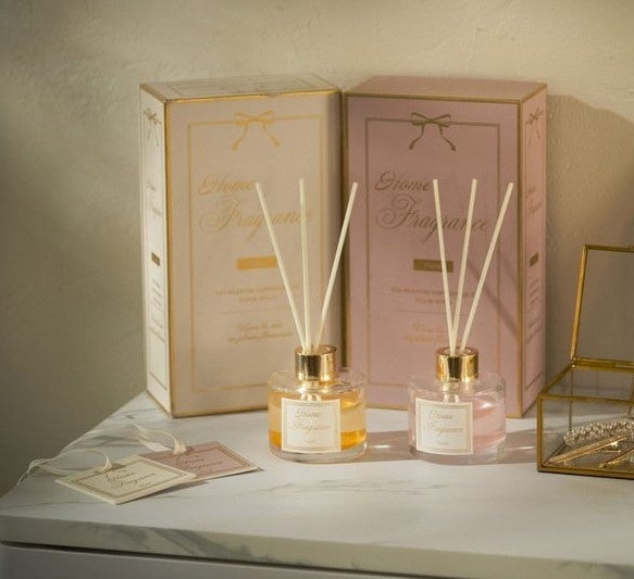 ディフューザー100MLとクッションサシェのお得なフレグランスセット。ラッピングされたような外箱なので、ギフトにもおすすめです。