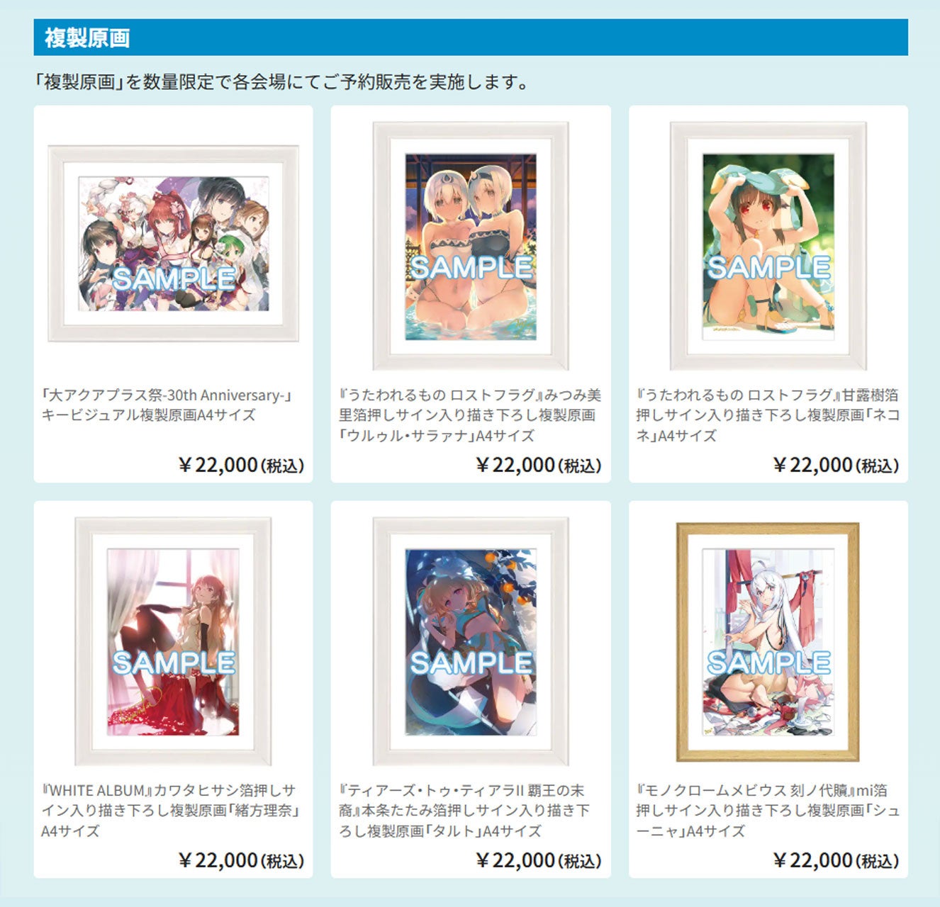 ・「大アクアプラス祭-30th Anniversary-」キービジュアル複製原画A4サイズ 22,000円(税込)