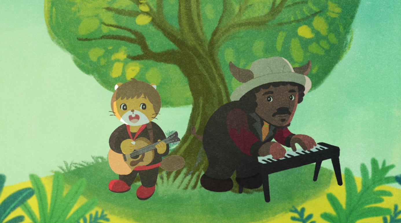ミュージックビデオでは、大きな木が立つ丘の上に、楽器を持ったスキマスイッチの二人がやってくるところからスタート。ビーバーになった大橋卓弥さん、バイソンになった常田真太郎さんの歌・演奏に合わせ、気持ち良い風がしまじろうたちのいるところも吹いてきます。作りたいものがあってケンカしたり、仲直りしたり。言葉にする大切さを感じながら、最後にはしまじろう、みみりん、とりっぴい、にゃっきい、みんなで力を合わせて丘の上の野外フェスの準備を助け合い、夕方の小さな丘のフェスを盛り上げていきます。