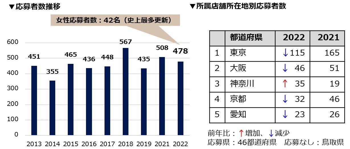 ・所属店舗所在地は東京都が最多の115名、応募県数は鳥取県を除く、46都道府県となり過去最多を記録。都市部一極集中の傾向は弱まり、コロナ禍での生活スタイルも影響し、地方への移住など関心が高まる中、地方で活躍する若手料理人からの関心度が向上している。