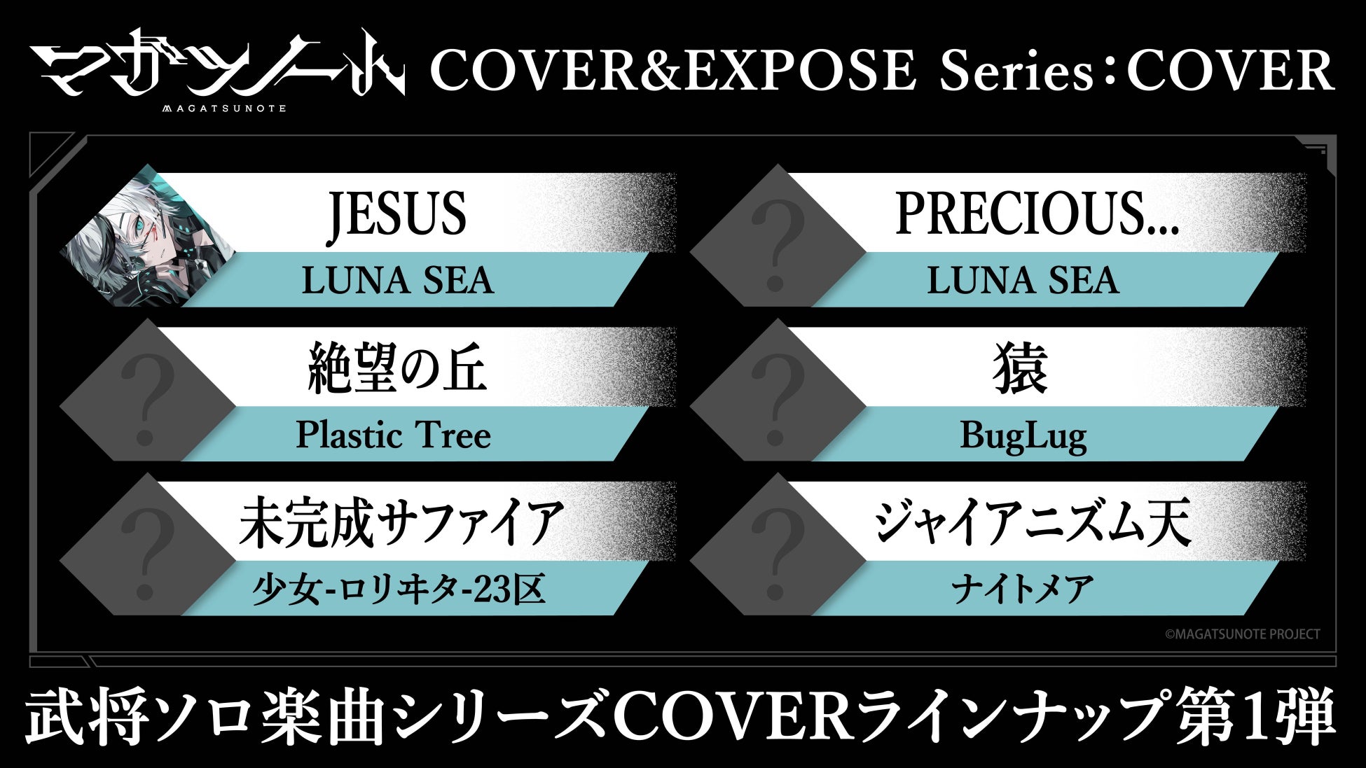 このたび【COVER】シリーズで歌唱する楽曲の一部ラインナップとともに、第1弾楽曲として、政宗(CV:峯田大夢)がLUNA SEAの『JESUS』をカバーしたMVを公開いたしました。他楽曲を歌唱する武将や【EXPOSE】シリーズについては今後順次発表いたします。
