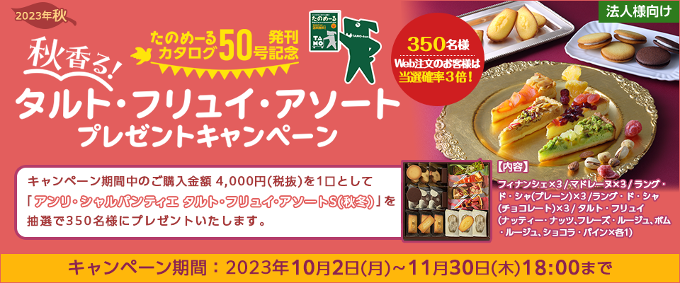 カタログ50号発刊を記念して、法人のお客様へ日ごろのご愛顧への感謝を込めたプレゼントキャンペーンを10月2日(月)より実施します。抽選で350名様にアンリ・シャルパンティエ タルト・フリュイ・アソートが当たるチャンス!